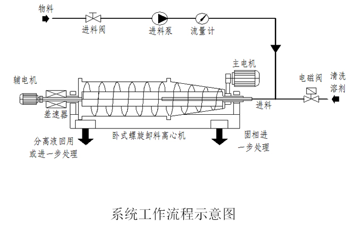 下图描述了离心机的主要设备和系统进行工作时的工艺流程,该系统主要包括卧式螺旋卸料沉降离心机(主机)、电器控制系统、无轴输送机、自动控制加药系统。